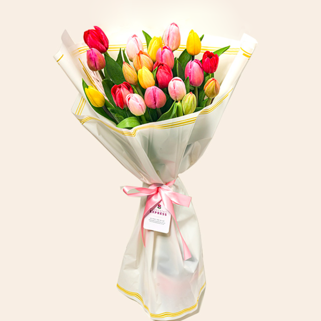 Hermosa presentación de 20 tulipanes coloridos en ramo acompañados de finas hojas de gardenia.